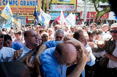 A confusão começou pouco depois da chegada de José Serra a Campo Grande. O candidato chegou a caminhar por cerca de cinco minutos, mas foi cercado por manifestantes com cartazes com ofensas a ele – em alguns deles era chamado de “assassino” – e bandeiras do PT. Um grupo de cerca de 30 pastores da Assembléia de Deus improvisou um cordão de isolamento para proteger o candidato, mas a confusão já tinha se espalhado.