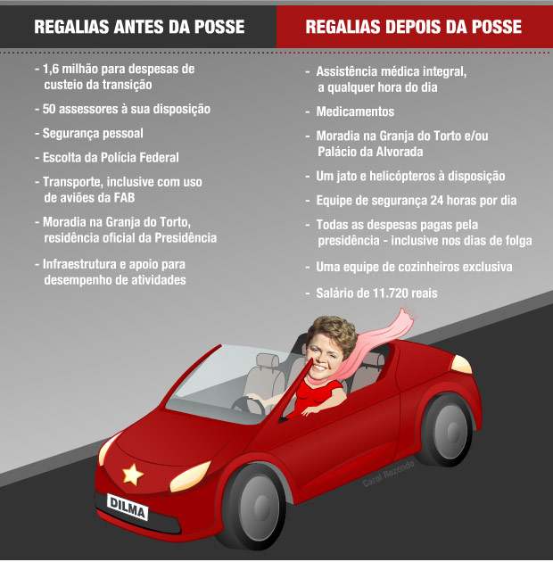 Terminado o mandato de Dilma, acabarão também as vantagens de ser presidente. Algumas, entretanto, permanecerão para sempre. A petista terá direito até o fim de seus dias a quatro servidores - para segurança e apoio pessoal - e dois veículos oficiais com motoristas. O dinheiro sai do bolso do contribuinte. Texto e infográfico do portal da revista Veja